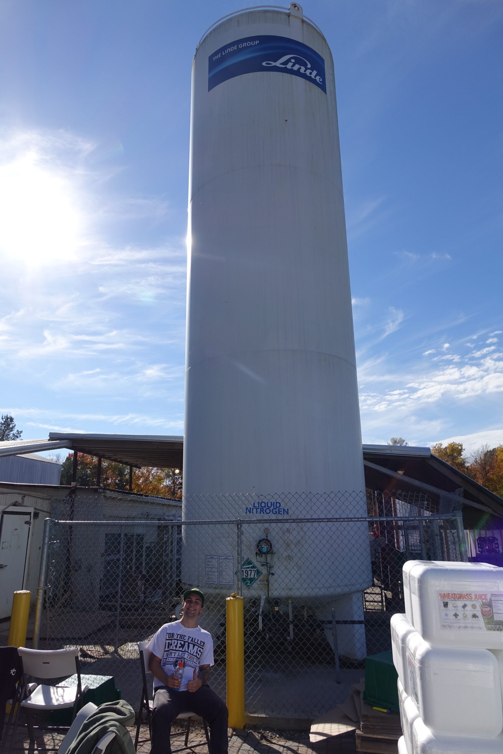 We start with 11,000 gallons (41,639 liters) of liquid nitrogen. Liquid nitrogen is stored at -321 Fahrenheit (-196 Celcius). The power of our freezing system is staggering and one of the most important factors in helping us achieve the juice quality we seek.